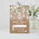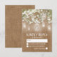 Twinkle lights country wedding response cards featuring a rustic brown burlap effect background, elegant mason jar string lights, baby breath flowers and white wording.