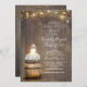 Floral rustic graduation party invitation features wooden wine barrel, baby's breath flowers, the string of lights and vintage lamp - lantern
