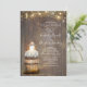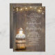 Floral rustic wood engagement party invitation features wine barrel, baby's breath flowers, the string of lights and vintage lamp - lantern