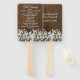 Rustic wedding themed program fan done in a dark wood look with graphics of white baby's breath flowers, along the bottom. Personalise the white text to read what you want.