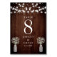 Baby's Breath String Lights Elegant Wedding Table Number. Floral baby's breath and rustic string lights set against an elegant romantic wood background. Perfect for a country or winter event. Personalise this custom design with your own details.