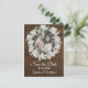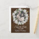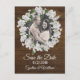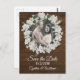 Rustic chic wedding save the date postcard done in a dark wood look with graphics of a baby's breath floral wreath framing the happy couple's photograph. Personalise with your picture and text to suit your needs. Matching products are available.