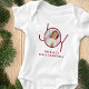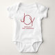 This festive Baby Boy's First Christmas bodysuit is decorated with the word JOY on a maroon-red background.