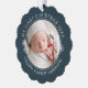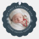 Modern keepsake baby's first Christmas personalise paper ornament in curve letters and line art of snowflakes overlaying a blue/green with your favourite photo.