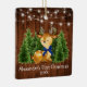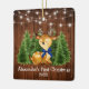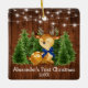 Baby's First Christmas Watercolor Woodland Animal Forest Deer Pine Trees Ornament. Includes Baby Deer with blue bow on forest greenery and string lights. Rustic Country Wood. Add Name.