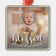 This charming baby's first Christmas holiday ornament features your baby's photo, name or any other message and BLESSED on the front (can be deleted.) PHOTO TIP: Crop your high resolution photo into a square as you want it to appear on the ornament BEFORE you upload it. CHANGE the saying, the fonts, font color using the Customize further link.