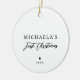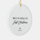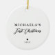 Celebrate your little one's first holiday season with this personalized baby’s first Christmas ornament, designed to be a timeless keepsake you’ll treasure for years to come. The front features a minimalist layout with elegant black typography on a crisp white background, combining classic serif and modern script fonts for a sophisticated look. A small heart icon and customizable year complete the clean, stylish design, making it a perfect addition to any Christmas tree, whether your style is traditional, modern, or rustic. The reverse side includes space for a full photo, allowing you to showcase your baby's sweet face and capture the joy of their first festive season. Whether you’re buying for your own baby or gifting to new parents, grandparents, or godparents, this high-quality printed ornament creates a heartfelt moment that will be remembered every year when decorating the tree. Ideal for celebrating new arrivals and first-time parents, this ornament also makes a thoughtful baby shower or holiday gift, preserving the magic of a newborn’s very first Christmas in a beautiful and lasting way.
