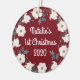 This first Christmas ornament features a festive watercolor floral wreath design. Personalise it with your text on the front and baby photo on the back.