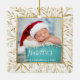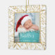 Celebrate baby's first Christmas with this beautiful keepsake ornament. Easily replace the sample image with your own favorite photo and customize it with baby's name in white handwriting font and the year below. (The design works best with photos that have a dark background in the lower area.) The photo is framed by an elegant square frame decorated with hand-drawn gold foliage on a white background.