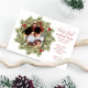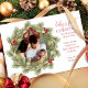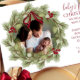 babys first christmasholiday birth announcementred and green wreathfamily baby photo collageelegant greenery foliagewinter holly berriesminimalistbrush script typographyholiday photo cardsunique circle