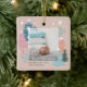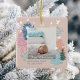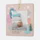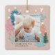 Elegant and beautiful baby's first Christmas keepsake ornament. Magical and whimsical two-sided baby photo Christmas tree forest ornament. Design features our hand-drawn chic pastel colour Christmas trees, falling white snowflakes, and doves. The soft pastel colours evoke a message of hope, joy, and peace. "Frist Christmas" is placed over the photo placeholder and personalised with the year and baby's name. All artwork is hand-drawn original artwork by Moodthology Papery.