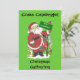 This flat card party invitation is green with a cute Santa Claus holding a green sign that says Baby's 1st Christmas. He is standing in snow by a decorated Christmas Tree surrounded by animals including red birds, a squirrel, and bunny. Customise your information and add your own photo with the templates.