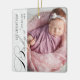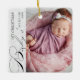 Baby's First Christmas photo ornament with vertical photo, elegant calligraphy and delicate white snowflakes on a silver grey border. The photo template is ready for you to add your photo, baby's name, the year and your custom text on the back. With the exception of the handwritten text used for Baby's, First and Christmas, all of the wording is fully editable so you can add birth stats or other custom text. If you have any problems with placement, try cropping your pic to a portrait format and re-uploading