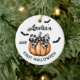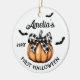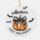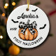 Baby's First Halloween Pumpkin Bow Bats Ceramic Ornament. A custom baby's name in a trendy script, orange pumpkins with cute bow and black bats. Personalise the ornament with your baby's name and year. A lovely Halloween holiday keepsake.