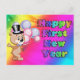 Cute little teddy bear wearing a top hat and bow tie carries balloons and wishes baby a happy first New Year.