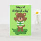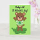 This greeting card shows a smiling brown bear with rosy cheeks and long lashes, standing proudly as if waving hello to someone it adores 💚. The bear wears a green-and-white striped T-shirt with a three-leaf shamrock on the front, adding a sweet St. Patrick’s Day touch. Its arms are lifted high in an excited, welcoming pose that feels like a friendly hug from across the room. Under its feet sits a larger, darker emerald four-leaf clover, giving the character a lucky little stage. The background is a bright lime green that keeps the scene cheerful and festive ☘️. Across the top, the phrase “Baby’s 1st St. Patrick’s day!” appears in black cursive lettering, centred and easy to spot. The bear’s open-mouthed grin and gentle blush suggest the kind of happy attention you’d see shared between close family or friends. The green shirt stripes, shamrock emblem, and layered clovers stand out crisply against the smooth lime field.