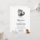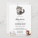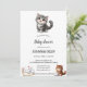 Adorable baby shower invitations with a watercolor illustration of a tabby kitten in a field of wildflowers. Off-centre design with script accents. The reverse side is sage green. Purr-fect for a spring baby shower.
