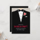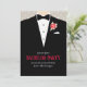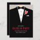 Elegant graphic groom in tuxedo and a single red rose bachelor party invitation. Edit these invitations with your own words, grooms name and pre wedding event details. © Unique design and graphic art by Sarah Trett. www.sarahtrett.com for www.mylittleedenweddings.com