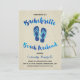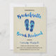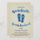 A cute bachelorette party invite for a weekend at the beach, with pretty blue watercolor calligraphy, blue faux glitter sandals, and a light brown wood grain background.