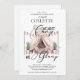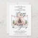 A boho watercolor bachelorette glamping party under the stars, featuring a cute whimsical glamping style teepee and string lights and the quote: "We don't camp, we glamp". Pastel pink and green on white.