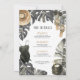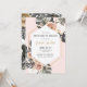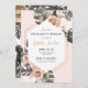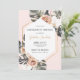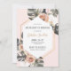 Tropical bachelorette party beach weekend getaway invitation features watercolor monstera and palm leaves on pink background. Invitation details inside gold frame. Weekend order of events on back with swimsuit, straw hat, and tropical drinks.