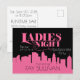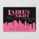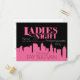 Bachelorette party invitation design with creative lettering, cityscape, pink and black colours. Appropriate design for some fun for the bride before the wedding.