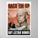 This vintage WW2 poster features General Dwight Eisenhower holding a map and binoculars. Behind him troops, tanks, and aircraft engage in battle. It reads, "Back ‘Em Up Buy Extra Bonds". Celebrate American and World War II History with this digitally restored vintage war poster from The War Is Hell Store.