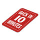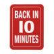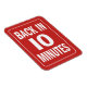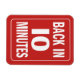 Back in 10 minutes magnet to use on the door of your business, store, office or home to let customers or friends know you are out but will be back shortly. Change the red background to a different colour if you like.