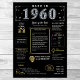 Step into 1960 with our captivating digital birthday poster, brimming with historical facts, noteworthy events, and intriguing stories from the past. Adorned with elegant gold and silver details set against a bold black background, featuring unique symbols and stylish text, this birthday poster exudes timeless charm. Whether sparking conversations at birthday gatherings or cherished as a keepsake, it evokes nostalgic memories.