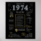 Transport yourself back to 1974 with our captivating digital birthday poster, rich with historical facts, noteworthy events, and intriguing stories from the past. Decorated with elegant gold and silver accents set against a striking black backdrop, adorned with unique symbols and stylish text, this birthday poster emanates timeless charm. Whether igniting conversations at birthday gatherings or cherished as a memento, it invokes nostalgic reminiscences.