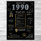 Step into 1990 with our captivating digital birthday poster, overflowing with historical facts, significant events, and mesmerising narratives from the past. Adorned with elegant gold and silver accents against a striking black backdrop, this birthday poster emanates timeless charm.