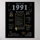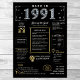 Step into 1991 with our captivating digital birthday poster, overflowing with historical facts, significant events, and mesmerising narratives from the past. Adorned with elegant gold and silver accents against a striking black backdrop, this birthday poster emanates timeless charm.
