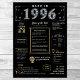 Step back into 1996 with our captivating digital birthday poster, brimming with historical facts, significant events, and enchanting narratives from the past. Adorned with elegant gold and silver accents against a striking black backdrop, this birthday poster exudes timeless charm.