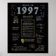Step back into 1997 with our captivating digital birthday poster, brimming with historical facts, significant events, and enchanting narratives from the past. Adorned with elegant gold and silver accents against a striking black backdrop, this birthday poster exudes timeless charm.