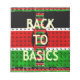 The design features the flag's colours—black, red, and green—in a brick-like, textured pattern, giving the piece a tactile, handmade feel. The iconic Maasai shield and spears are centred over the flag, while the bold, simple yellow text "BACK TO BASICS" emphasizes the importance of culture, unity, and national foundation. The entire motif is framed by a decorative border of miniature Kenyan flags, completing this proud, patriotic look.