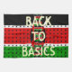 The design features the flag's colours—black, red, and green—in a brick-like, textured pattern, giving the piece a tactile, handmade feel. The iconic Maasai shield and spears are centred over the flag, while the bold, simple yellow text "BACK TO BASICS" emphasizes the importance of culture, unity, and national foundation. The entire motif is framed by a decorative border of miniature Kenyan flags, completing this proud, patriotic look.