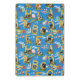 Capital letters A B C D E F G H I J...house pets and school tools against a blue sky repeat pattern