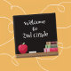 Welcome your young students back on their first day of school with those square pin buttons featuring a design of a faux chalkboard , an apple , a piece of white chalk and a little stack of books .