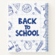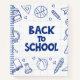 A cheerful notebook featuring a bold, handwritten-style “BACK TO SCHOOL” text block surrounded by hand-drawn doodle icons of school essentials. Dark blue icons include a backpack, pencil, ruler, paper aeroplane, alarm clock, open book, beaker, apple, basketball, magnifying glass, and paint palette. Set against a white grid background, this fun and educational design is perfect for students, teachers, and classroom use.