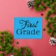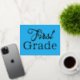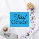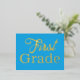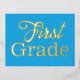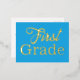 Welcome to first grade, postcard from the teacher. Customise the text for any grade, which is printed in foil lettering. Large wording covers the pretty blue card in gold, silver, or rose gold foil announces the upcoming year of school. On the back, the teacher can create a custom message to send to his / her students in blue, printed font. Include classroom information, day and time school begins, or anything the child and parents may appreciate.