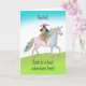 Thinking of You Back to School Unicorn Adventure, paper greeting card for a girl. Illustration of a young girl riding on a unicorn and she is ready for her back to school adventure. Light pastel colour theme. Girl is wearing a big pink hat, tulle skirt, chartreuse coloured top with dots, and is carrying a leather bag with a blue flower. Customise the text on the cover as you like. Art, image, and verse copyright © Shoaff Ballanger Studios, 2022.