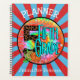 Student notebook for the fifth grade. Choose from ten different page interiors - wide ruled, sketch book, practice handwriting, graph paper, among many. The planner can be personalised with your name and title and features a colourful 5th grade sticker and a red and blue striped background. Great as a gift for back to school or as an end of year gift.