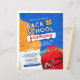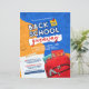 A fun back to school supply and backpack giveaway flyer features a 3D script, blue and orange background with school supplies and a red backpack.