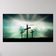 The joy of the resurrection of Jesus Christ is beautifully depicted in this dramatic blue and black photo of the crosses at Calgary, backlit by the rising sun, with clouds in the sky and beautiful rays of light illuminating the Cross. Makes a great poster for Easter, or all year round.