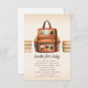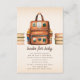 Adventure themed baby shower featuring illustration of a brown leather backpack adorned with wilderness, camping, and hiking themed patches with two baby bottles on the sides. Books are stacked on both sides of backpack.