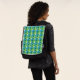 Quilted block in green and blue Kaleidoscopic pattern. Eight points around a centre of green. White square in corners connect the patterns.