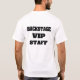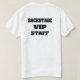 Simple phrase, “Backstage VIP Staff,” in black. Includes security shaped badge with a police star in the centre & words, “Concert Crew Est. 1969,” on the front of the shirt. Official concert security wear.