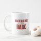 Fun coffee mug for those livin' the country life. "Backwoods Babe" distressed dark red text with fancy flourish