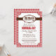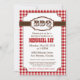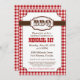 A barbecue party invitation. Picnic, barbeque, bbq. Red and brown. Chequered and gingham pattern, country western rustic. Bridal or wedding shower, holiday bbq, birthday celebration, etc.
