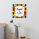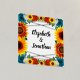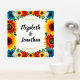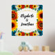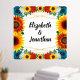 Elegant and colourful floral design for a backyard summer event. Features teal blue roses, white daisies, red wildflowers and sunflowers with gold geometric frame